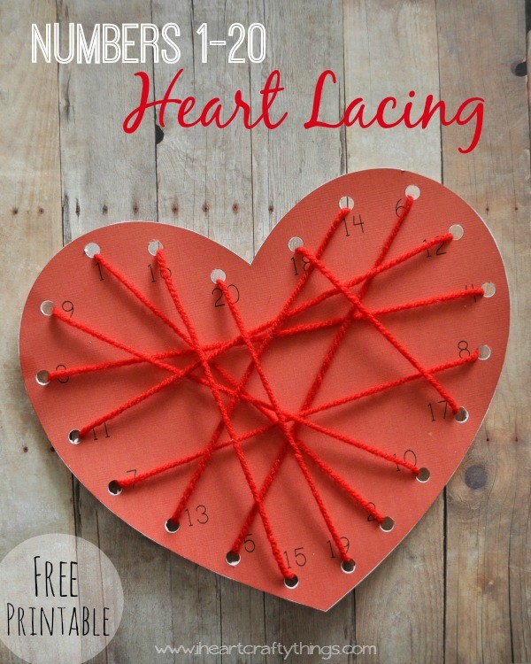 I have been working with my preschooler on recognizing her teen numbers and number 20. She can count them out loud proficiently, but we’ve needed some extra practice with recognizing those tricky teen numbers. As a form of practice, I made this Valentine’s Day themed Numbers Heart Lacing Activity. I love how it is not only number practice, but also incorporates working on fine motor skills with the lacing aspect of it.